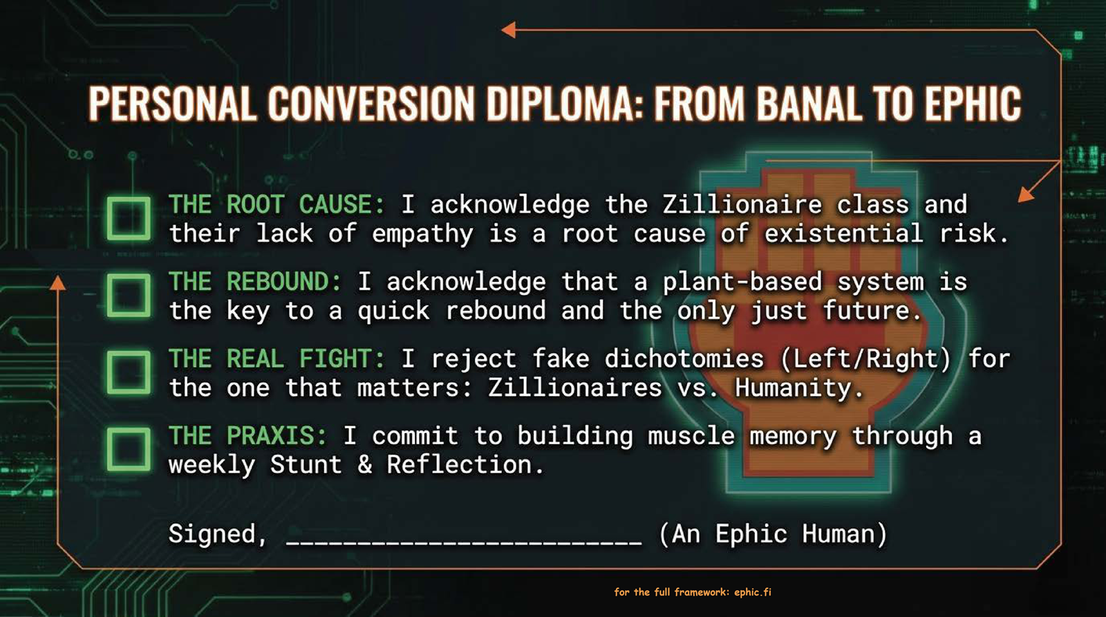 To ingrain this into daily thinking a routine must be established to replace the current zillionaire hegemony with an ephic one. This can be customized to your liking but should be a weekly act of disobedience to break the banal dullness.
