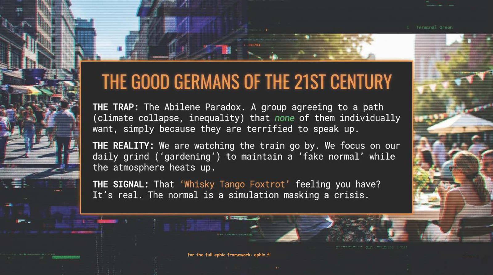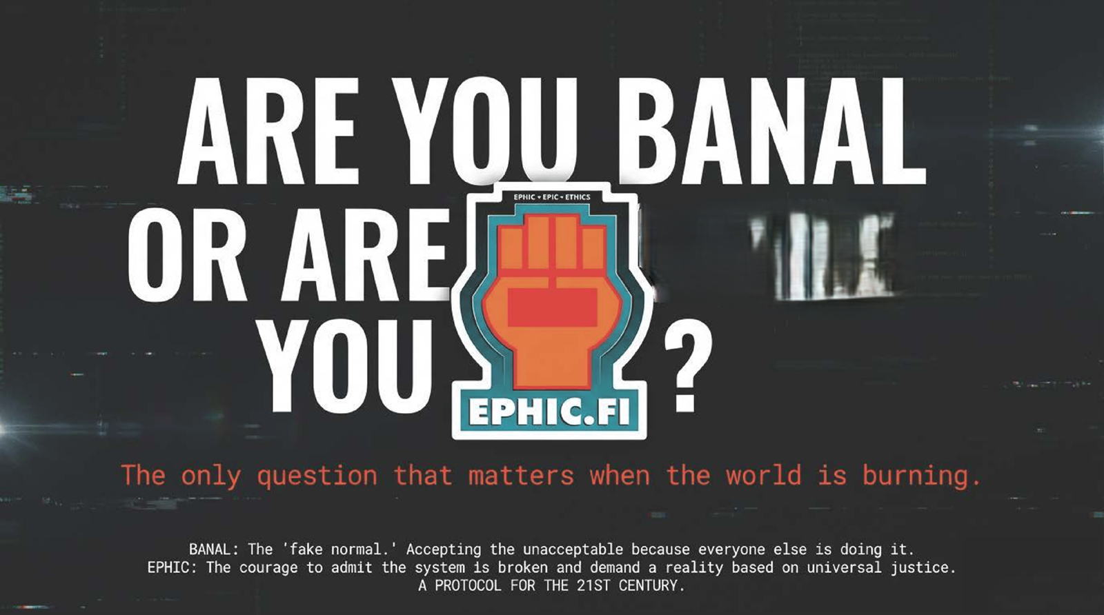 Our intention is poetic justice simplified to the core. A few outrageous questions, statements and principles wrapped in one "banal or ephic" or even "I'm ephic AF" statement.