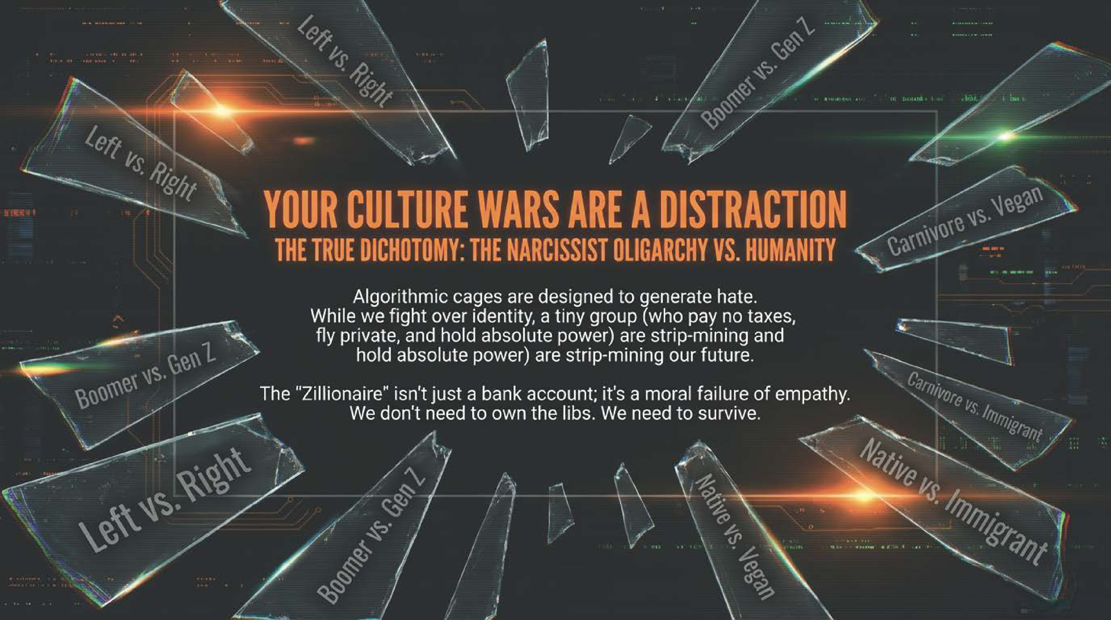 There's only one dichotomy with global generationwide implications and that's the zillionaire vs. normal people. This question forces the ephic wannabe to reach across the isles.