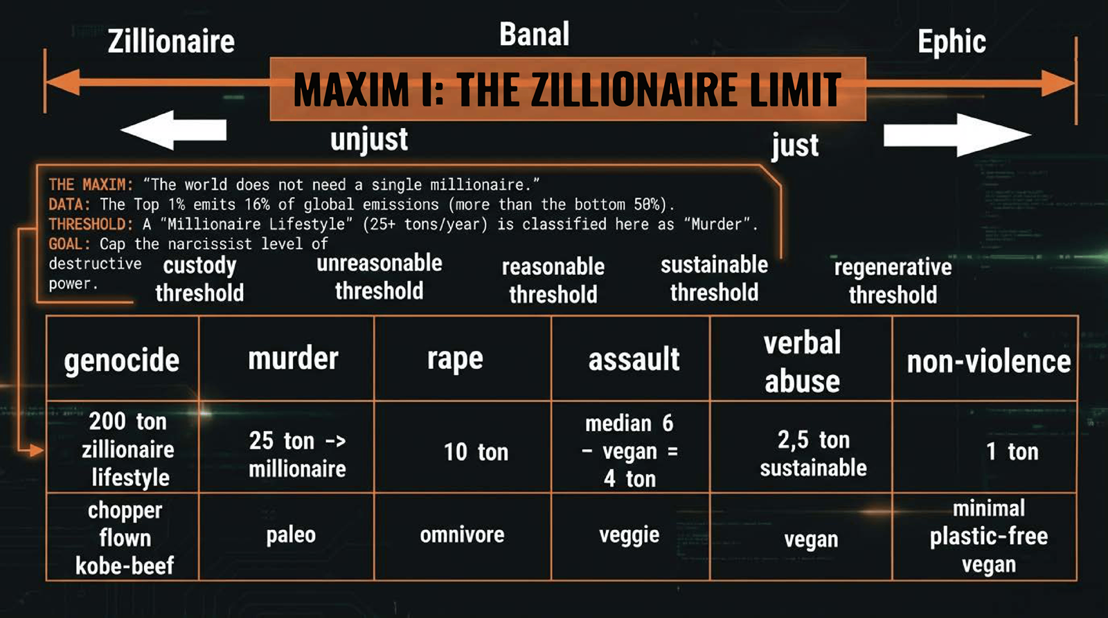 Do you dare to set concretic limits to sick individual destructive power in terms of personal emissions you're willing to limit it also politically. This maxim (rule of thumb) starts the discussion about the lifestyle after which a leader is stripped of all credibility of speaking of justice or ethics. We set this limit to the millionairish 25 ton cap but its meant to be only the beginning of the discussion. Talking about this alone is an act of bravery beyond any current politician.