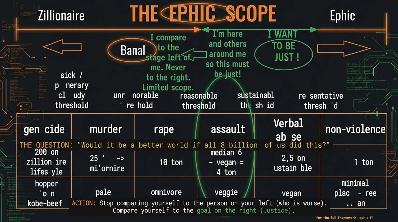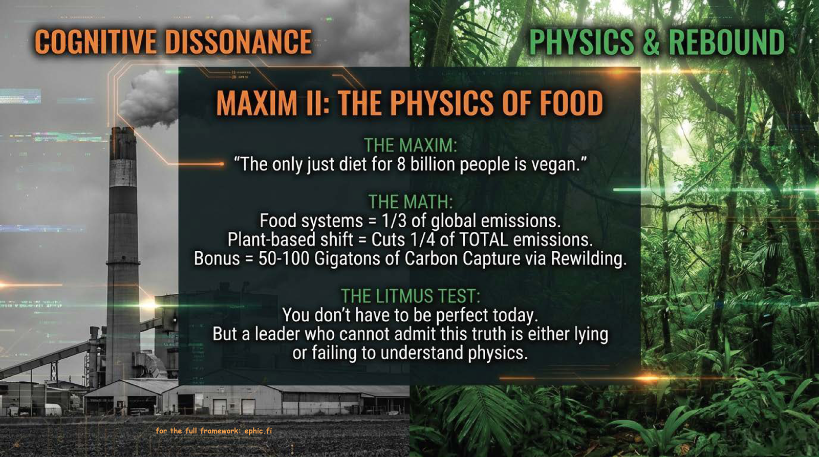 Simple test for the grasping of the laws of physics, the nature and ethics. Who dares to use the universal lens in a subject in the core of culture wars, guilt and human cognitive biases. "What is the most just diet for all 8 billion humans + the generations to come + other species" is a petaton thermonuclear weapon of honesty.
